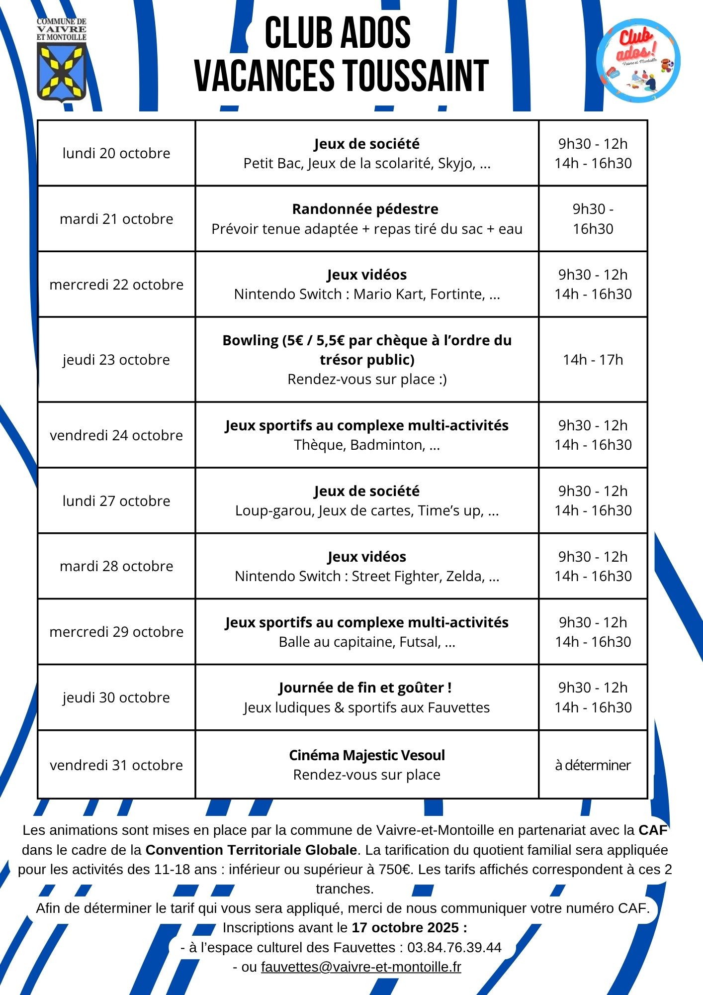 Dans le cadre du partenariat avec la C.A.F de la Haute-Saône, la tarification sera appliquée en fonction du quotient familial (inférieur ou supérieur à 750€) pour les activités des 11-18 ans.